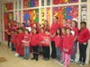The students, mostly dressed in bright red outfits, showed their school spirit in welcoming Jones and Pierce to their weekly gathering on the playground.