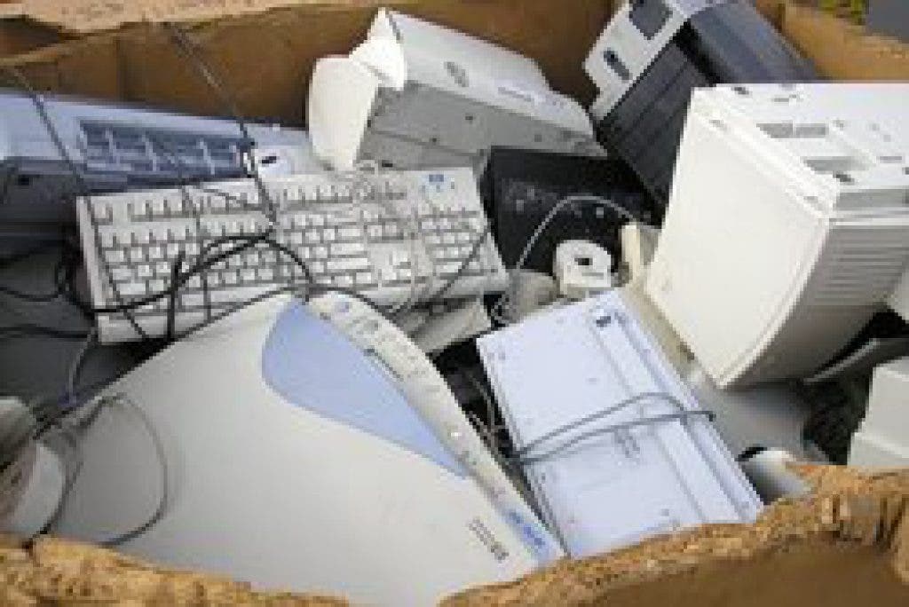 Items include computers, monitors, TVs, laptops, cables, printers, fax machines, scanners, DVD players, VCRs and other electronic items.