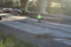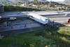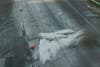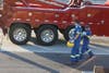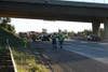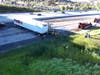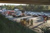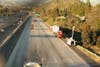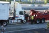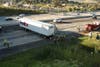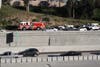 The FedEx truck was towed to the side of the freeway, freeing up a second lane as the cleanup continued. Sand was being spread on the spilled fuel. A hazardous materials team also was on scene.