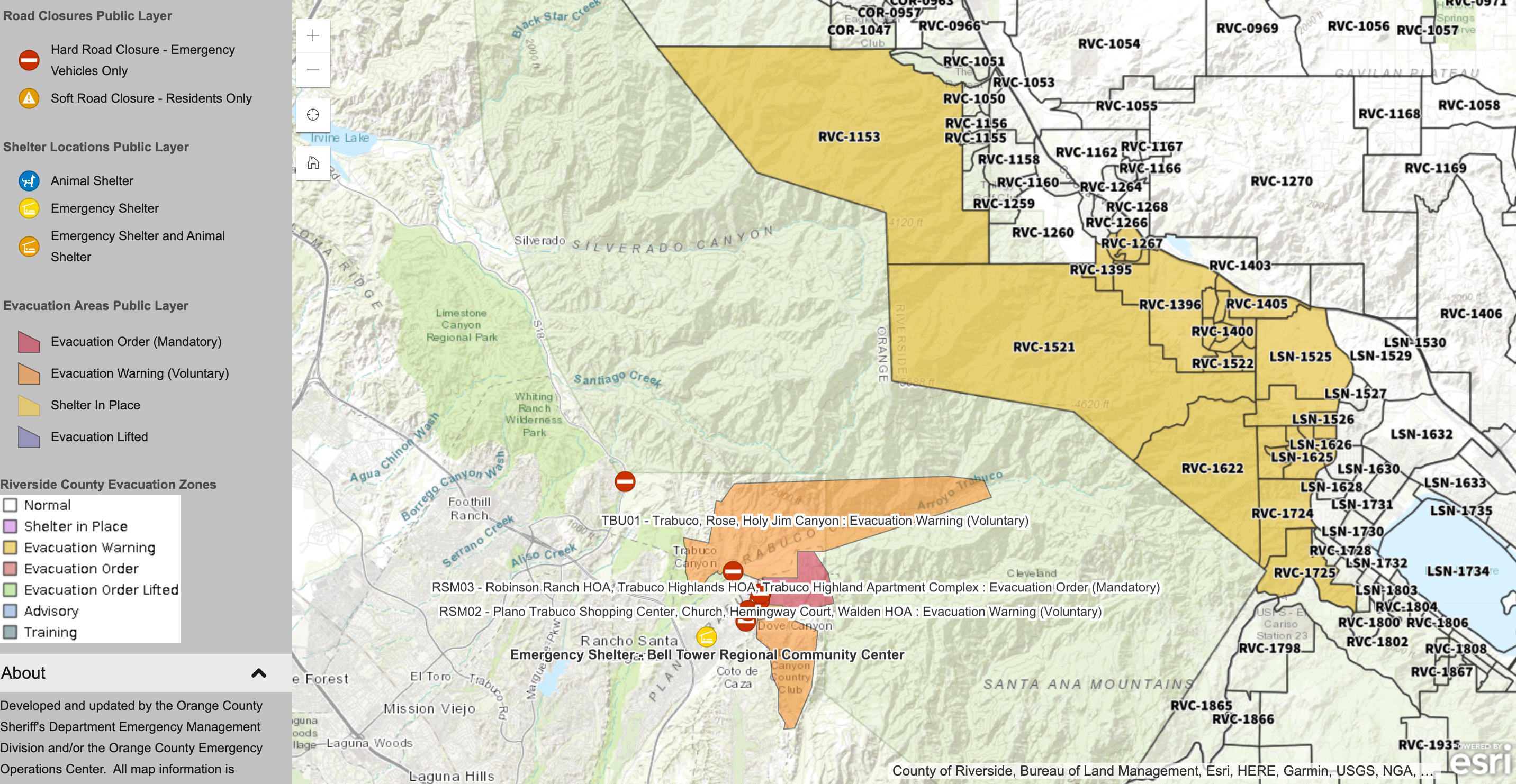 According to the Orange County Sheriff's Department, as of 4 p.m., the following neighborhoods were under Voluntary Evacuations Orders: Trabuco, Rose, Holy Jim Canyon, Plano Trabuco Shopping Center, Church, Hemmingway Court, and Walden HOA