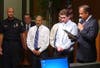 Brandon Neilson and Sam Medina draw thunderous ovation inside City Hall as they stand alongside the man they saved from drowning at Santa Margarita Catholic High.