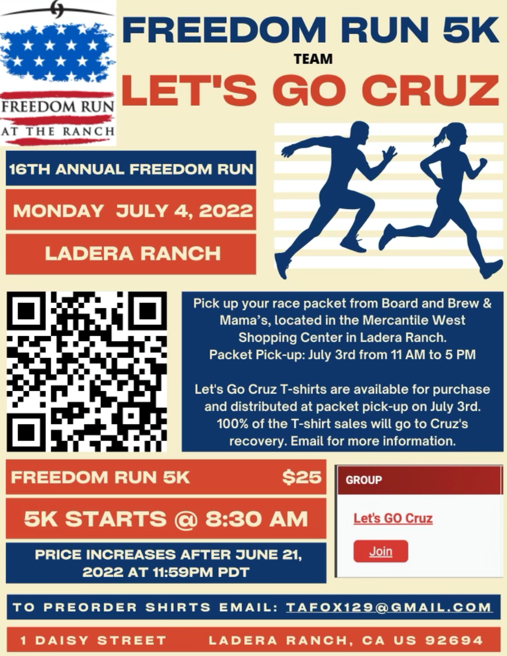 Residents who register under Team Cruz will have a percentage of their registration proceeds donated straight to the family. To register, residents can view the Freedom Run's website and enter the password "Cruz."