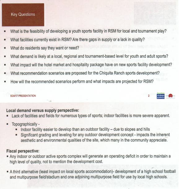 The goal is to be a destination for sports leagues that come from out of town, so that then means we want a hotel or two at Chiquita Ridge for them to stay at, which means we then want all the shops and restaurants so that they stay and spent their money in RSM and we collect the taxes. The projected tax revenue from a hotel for the city, works out to about $20,000 per year. Estimates are that they would average 5 room rentals a day, which doesn’t seem to create an attractive scenario for a builder.