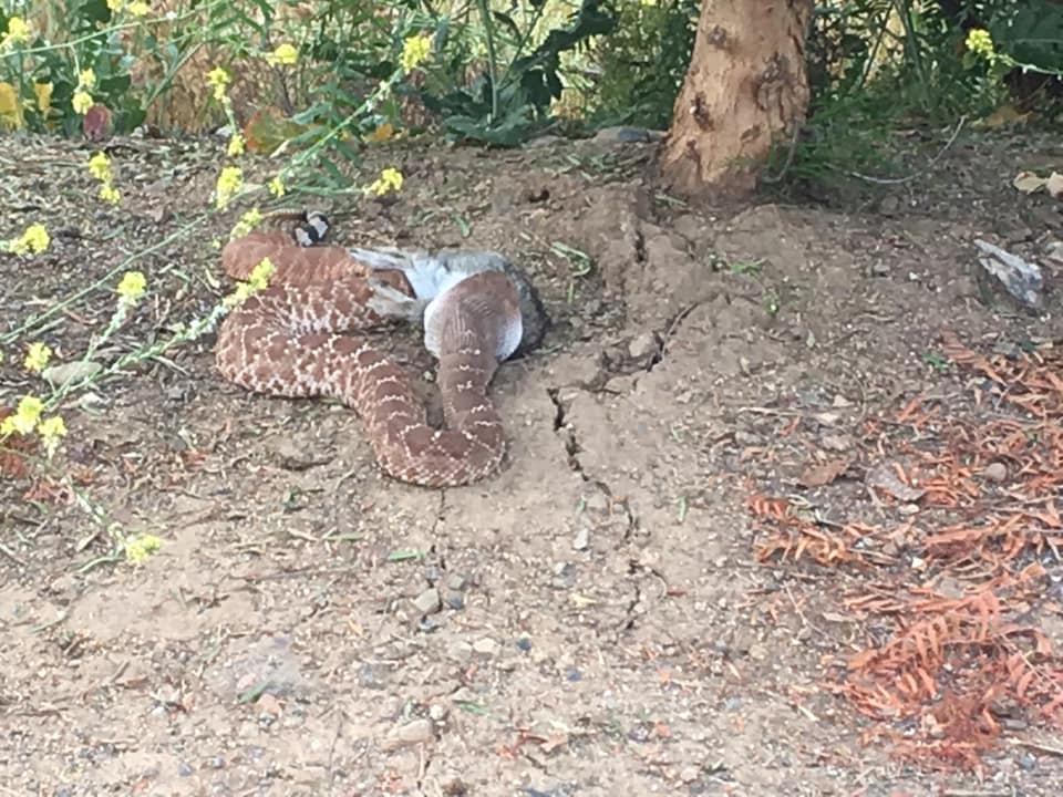 The rains this past year have led to an explosion of growth, both vegetable and animal, especially with rabbits and snakes. Just recently a resident snapped this photo of a rattlesnake eating a rabbit near Tijeras creek elementary school.
