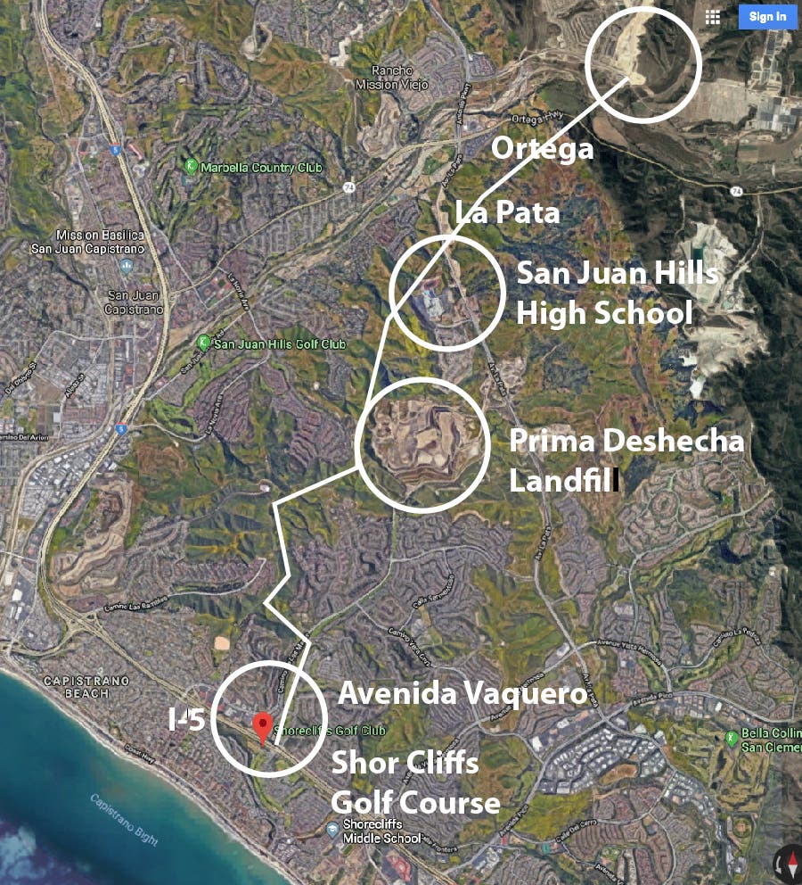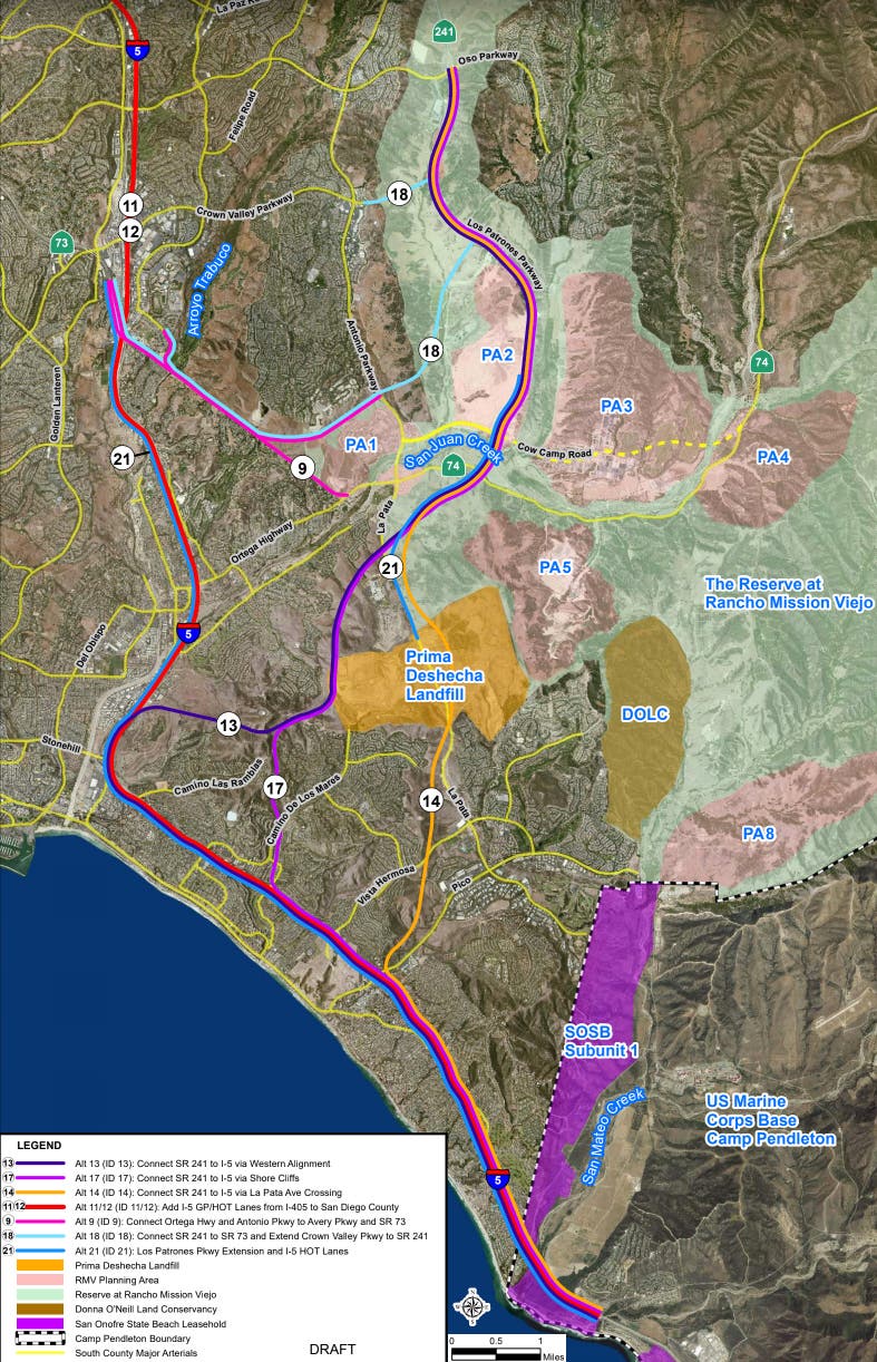 Alternative 17 would cross Ortega Highway and La Pata Avenue in unincorporated Orange County, and would run adjacent to the western boundary of Prima Deshecha Landfill in the City of San Juan Capistrano.