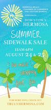 The Hermosa Beach Chamber of Commerce and Visitors Bureau host the annual Summer Sidewalk Sale in Downtown Hermosa Beach on Saturday, August 24th and Sunday, August 25th from 11 a.m. to 6 p.m. The event features live music, discounts and specials at local shops and restaurants in the Downtown area. Pick up specially priced merchandise at participating stores and sample a variety of dishes at local restaurants. Enjoy live music at Stars Antique Market and Java Man Café all day Saturday. On Sunday, when all the shopping is done, hang around for the final Hermosa Beach Summer Concert of the season featuring Lou Giovanetti with special guest Nutty at the Hermosa Beach Pier. For additional information, visit the website at http://www.hbchamber.net/news_events/2013_summer_sidewalk_sale.aspx.