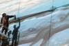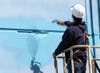 Wyland took action on the Wyland Whaling Wall onTuesday, using rollers, brushes and airless spray guns. When working on a canvass three acres in size, he noted, one must use technology.