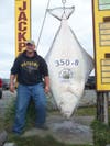 The monster weighed 350.8 pounds and put Aldridge in to first place in the Homer Jackpot Halibut Derby. It's the sixth heaviest halibut in the 25-year derby history. Aldridge caught the enormous flatfish on 80-pound-test line and a chunk of herring. Proud father Ronnie Aldridge did the harpoon honors. It took 45 minutes for the fish to be calm enough to be dragged on board.