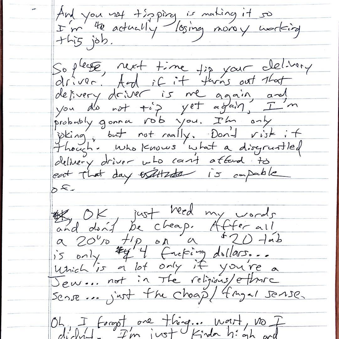 “So please, next time tip your delivery driver. And if it turns out that delivery driver is me again, and you do not tip yet again, I’m probably going to rob you. I’m only joking, but not really.”