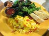 Next was a good size portion of The Scrambled ($7) with three scrambled eggs, medium salsa, a mixed green salad with vinaigrette and three pieces of bread and butter.