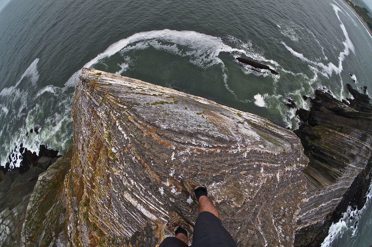 "I had to put my camera gear in a dry bag to get it across," he continued. "You have to tip toe pass a seal colony, attempting not to disturb them, and then up the jagged face. Once at the top, you have a sheer vertical drop to the water, and a epic view of the mainland."