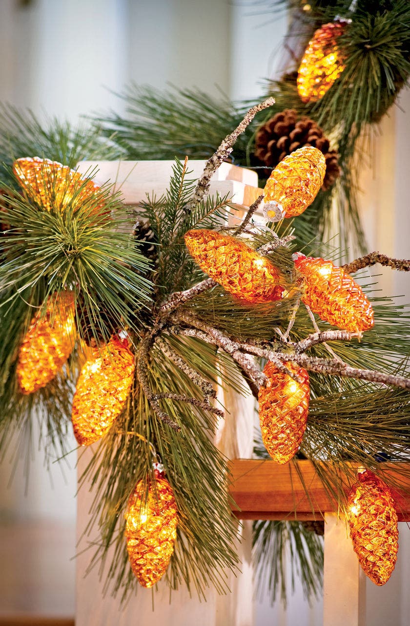 Then brighten up the display with some cool burning LED lights. Create a mantle display or centerpiece with the help of LED pillar lights. Or add a string of LEDs to your garland. Look for something unusual like pinecone string lights (gardeners.com) to add sparkle and charm to your display.