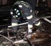 PHOTO 1: Fire Investigator David Perrone examines burned debris from an exterior home enclosure looking for clues to the fire cause and origin. CREDIT: Menlo Park Fire Protection District.
