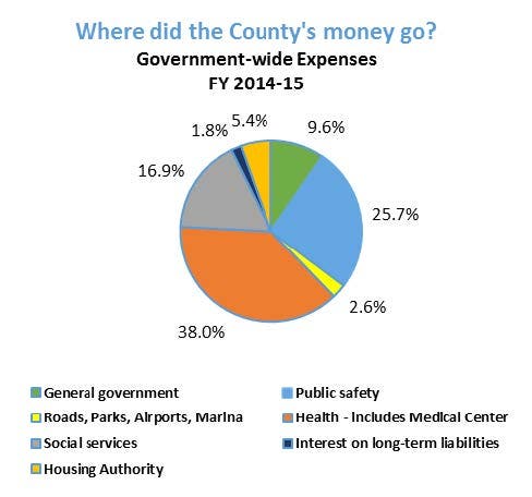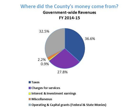 In FY 2014-15 the County’s government-wide revenues totaled $1.61 billion and expenditures totaled $1.25 billion.