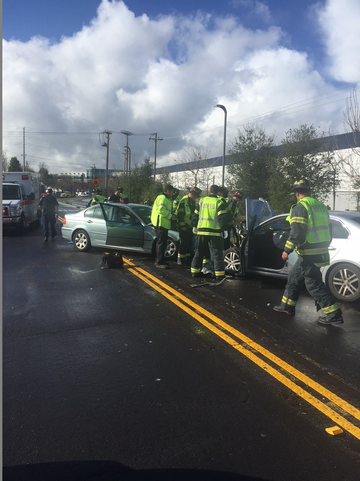 MENLO PARK, CA — Two people were hospitalized following a head-on collision Monday in Menlo Park on a roadway behind the headquarters of Facebook, according to Menlo Park Fire Protection District officials.