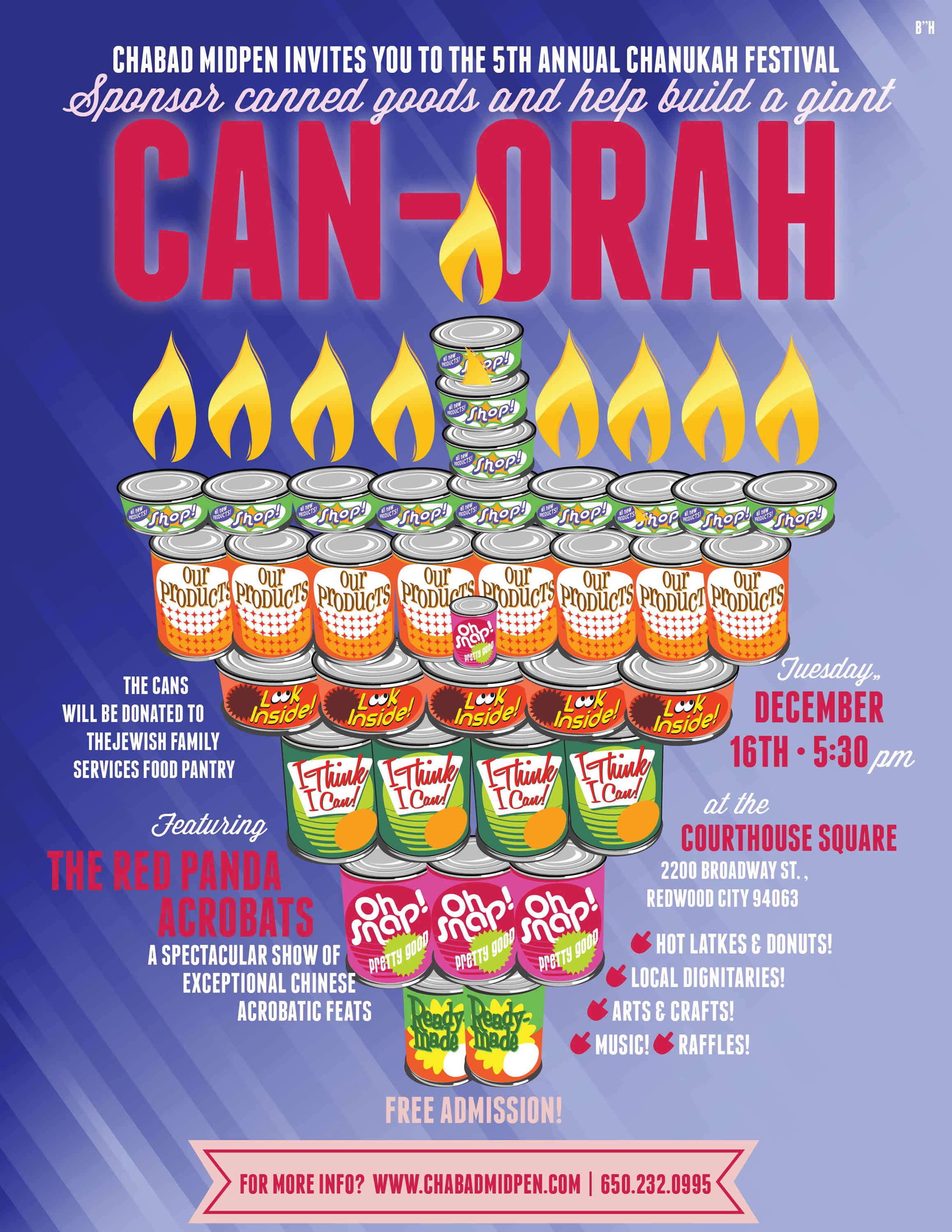 Join us in spreading the light this Holiday season by donating to help us build a CANorah (a Menorah made entirely from cans)! All cans will be donated to the JFCS (Jewish Family & Children Services) Food Pantry.