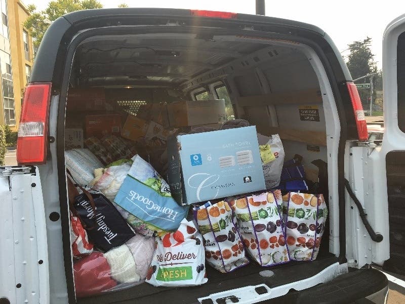 Their first stop was the Sonoma Family Support Center, a year-round shelter for women and families now caring for evacuees. Officials were overjoyed to receive 60+ blankets, diapers, wipes, and towels, so evacuees could shower away the smoke and dirt.