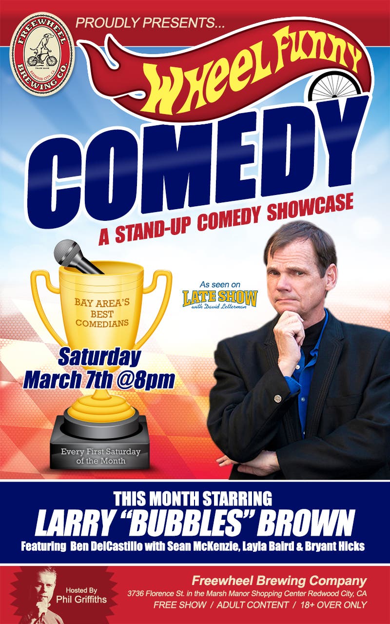 Saturday March 7th @8pm - Larry "Bubbles" Brown stars in the Wheel Funny Comedy Showcase at the FreeWheel Brewing Co. in Redwood City.
