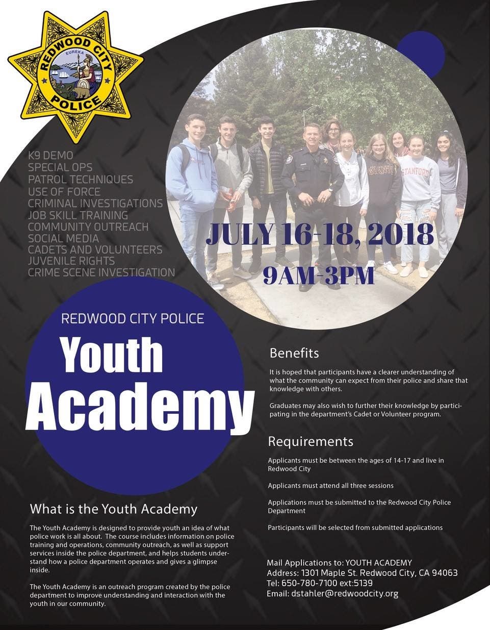 For more information on applying or other questions, contact Officer David Stahler at 780-7100, extension 5139. You can also email him at dstahler@redwoodcity.org.