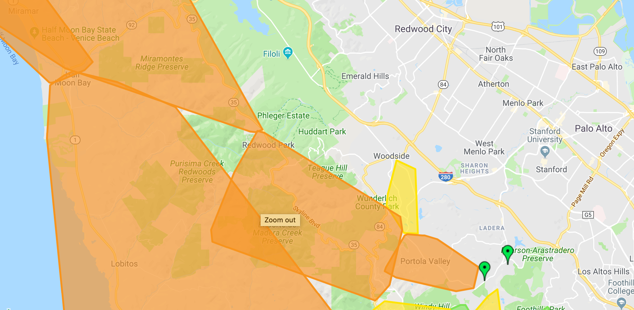 As of Thursday afternoon, here's what the outages near Redwood City and Woodside looked like, according to a PG&E online map: