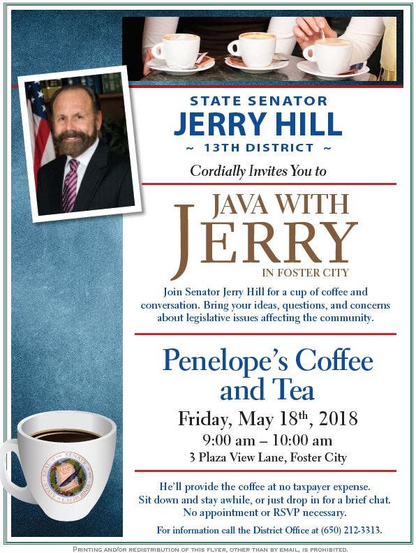 FOSTER CITY, CA – State Senator Jerry Hill is hosting a community "Java with Jerry" next week in Foster City.