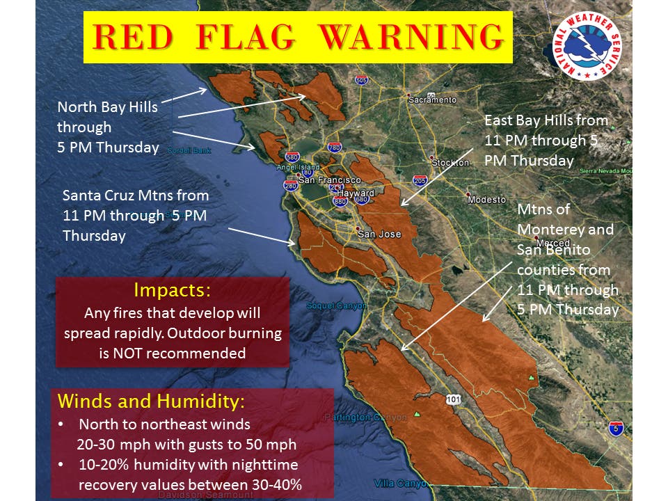 SAN MATEO COUNTY, CA — As wildfires in the North Bay continue to rage on, local winds are providing no help. What's more, much of the region is now under a Red Flag Warning.