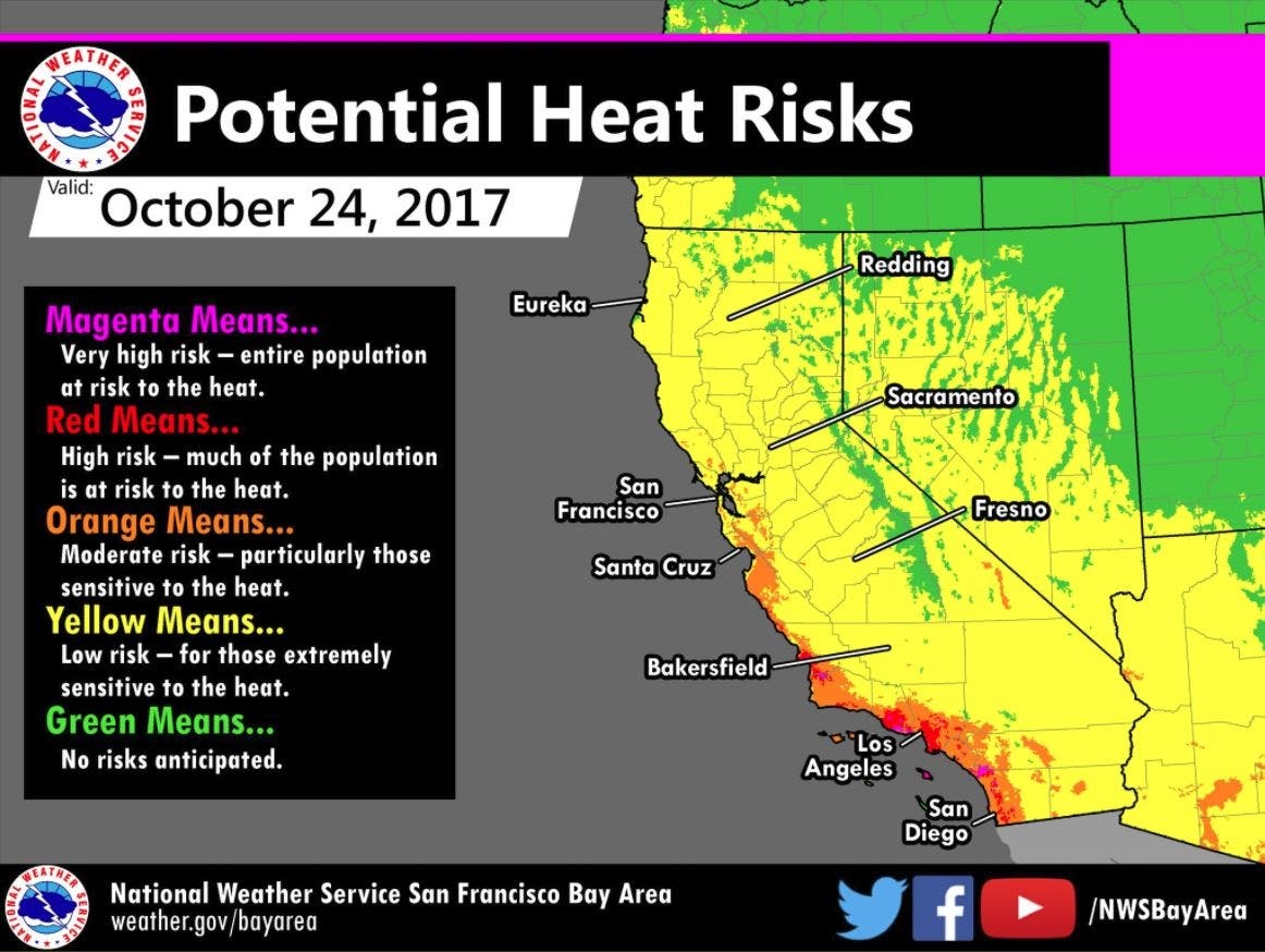 REDWOOD CITY, CA — Weather officials are warning Bay Area residents to prepare for some unseasonably hot weather in the coming days. The "rapid warming trend" is expected to peak on Tuesday, but temperatures will likely remain above normal through the end of the work week, "and perhaps into the weekend," according to the National Weather Service. Currently, it's expected to remain dry through Halloween.