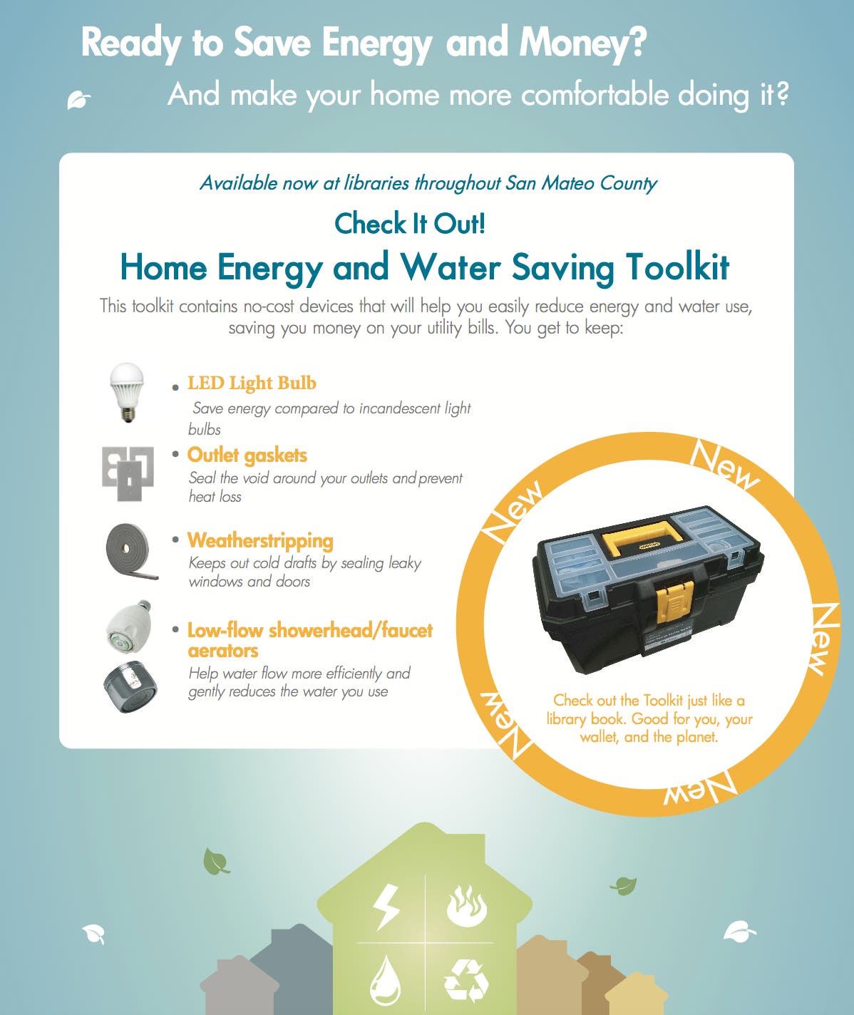 SAN MATEO, CA —Beginning April 25, county library users can borrow a “Check It Out!” Energy and Water Savings Toolkit from any community public library in San Mateo County. Outfitted with tools, supplies, measuring devices and a user-friendly guide, the toolkits can help residents conserve water, use less electricity and save money by taking a few simple actions.