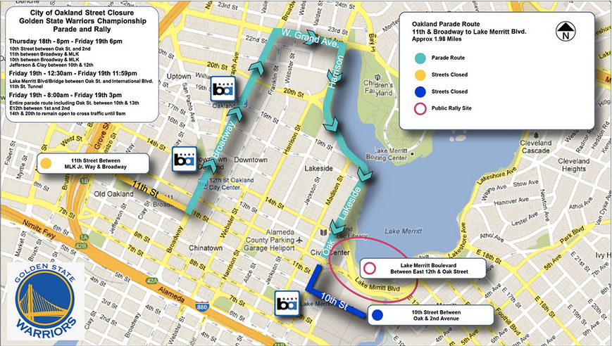 The parade will begin at Broadway and 11th Street and will continue north on Broadway before turning right on Grand Avenue, then right on Harrison Street to Lakeside Drive, which becomes Oak Street. The parade will proceed to the Henry J. Kaiser Convention Center for the rally, where fans can line up as soon as 5 a.m., team officials said.