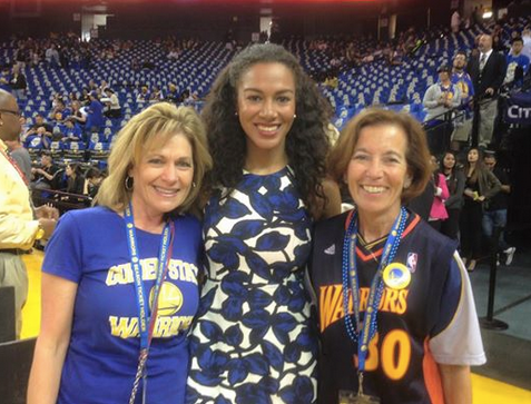 Photo of East Bay residents Robin Neal and Annette Maduell with sideline reporter Rosalyn ”Ros” Gold-Onwude showing off their #DubNation pride at a Warriors game.