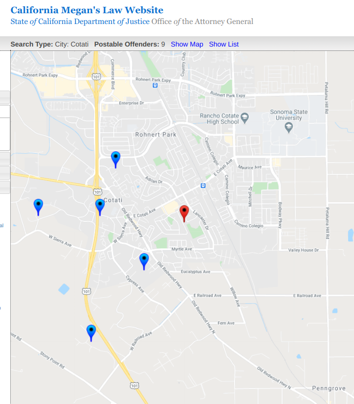 According to state officials, Rohnert Park has 41 offenders, while Cotati has nine. In Sonoma County, there are 604 registered sex offenders, 119 of whom are transients known to stay within the county.