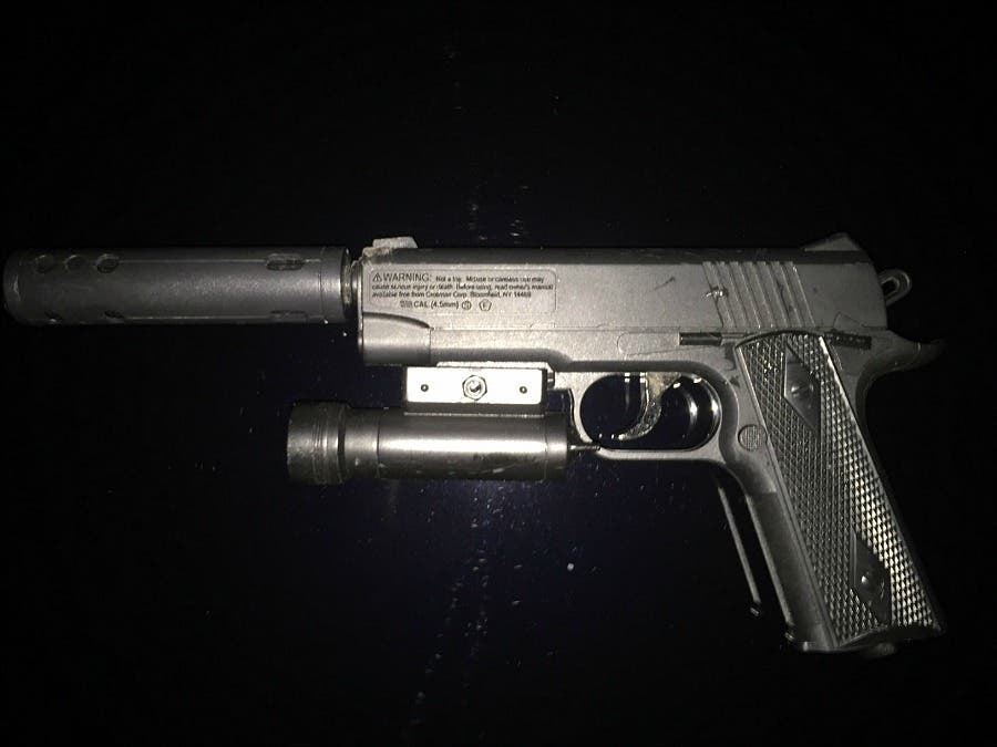 Upon further examination, the black handgun turned out to be a BB handgun with a fake light and silencer, according to public safety officials.