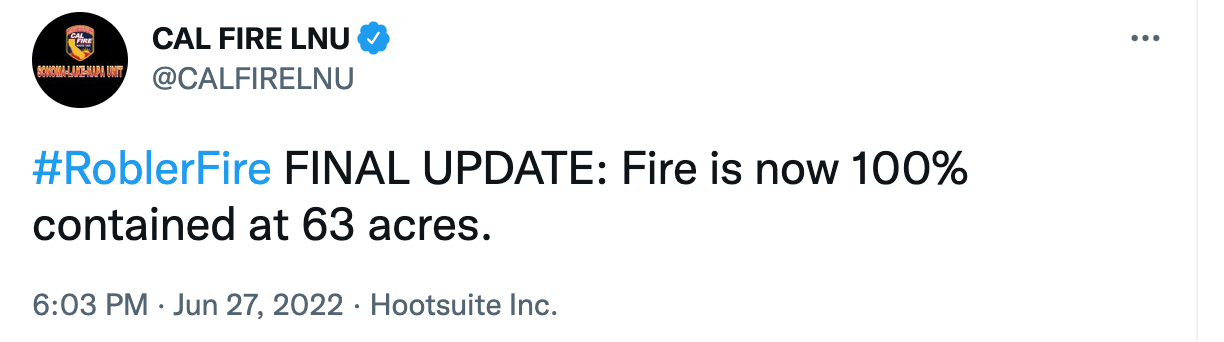 SONOMA COUNTY, CA — Cal Fire at 6 p.m. Monday declared the Roblar Fire west of Rohnert Park and Petaluma 100 percent contained at 63 acres.
