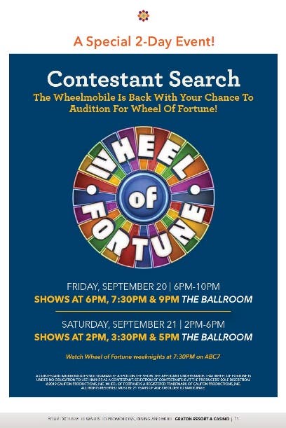"Wheel of Fortune" audition shows are scheduled to take place from 6 p.m. until 10 p.m. Friday, Sept. 20, and from 2 p.m. to 6 p.m. Saturday, Sept. 21 inside the Graton Resort & Casino Ballroom, 288 Golf Course Dr. West in Rohnert Park.