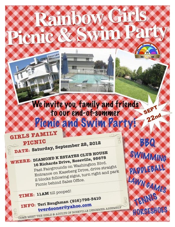 Rainbow Girls from Roseville DeRiemer Assembly are hosting an open invitation Family BBQ and Pool Party Saturday, September 22nd at 11am at the Diamond K Estates Club House.