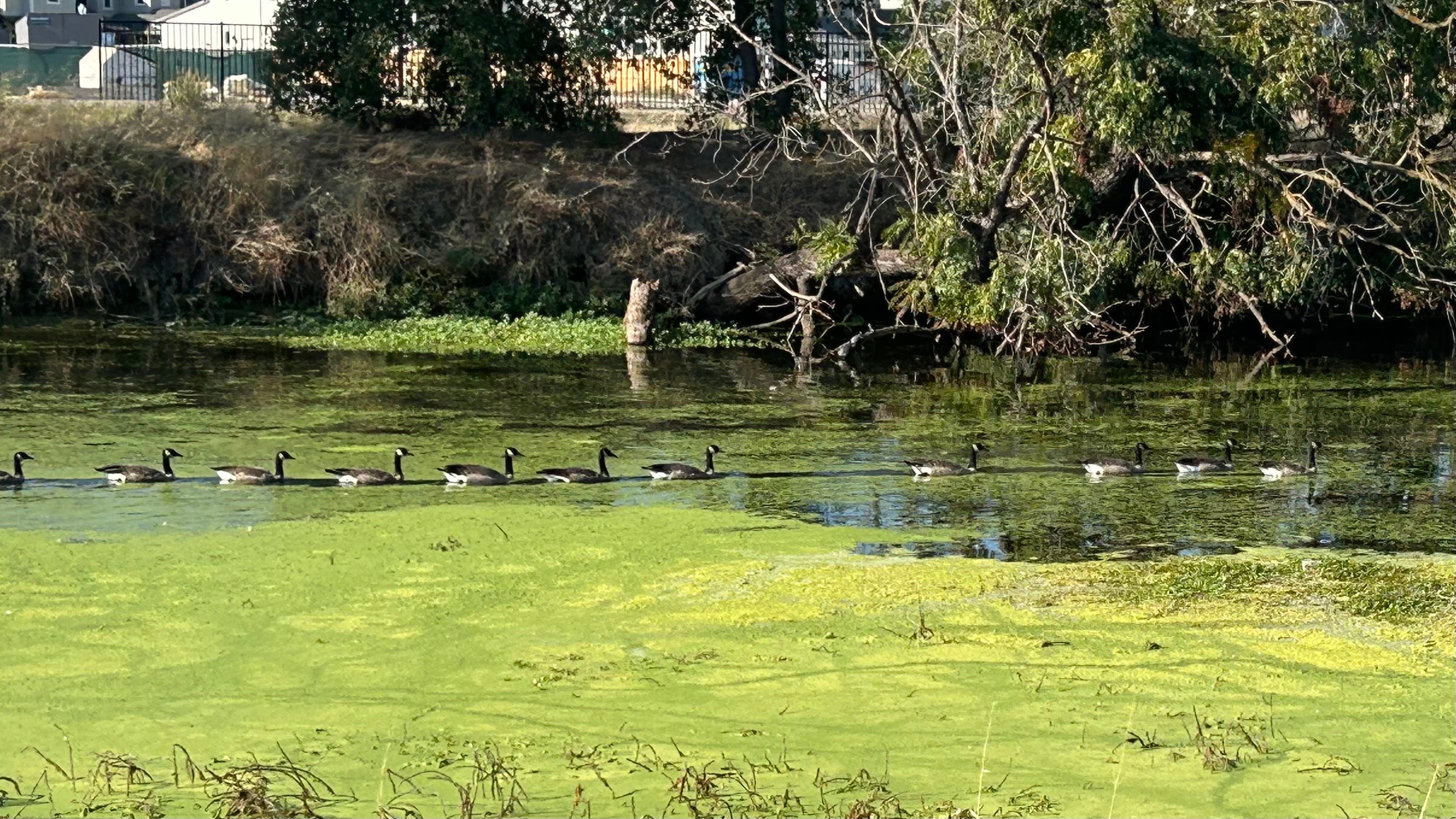 SACRAMENTO, CA — Many people have heard the phrase about getting our ducks in a row. These geese managed to get themselves into a row all on their own! Claus Weisemann snapped a pair of photos of the geese swimming in the Natomas Main Drainage Canal.