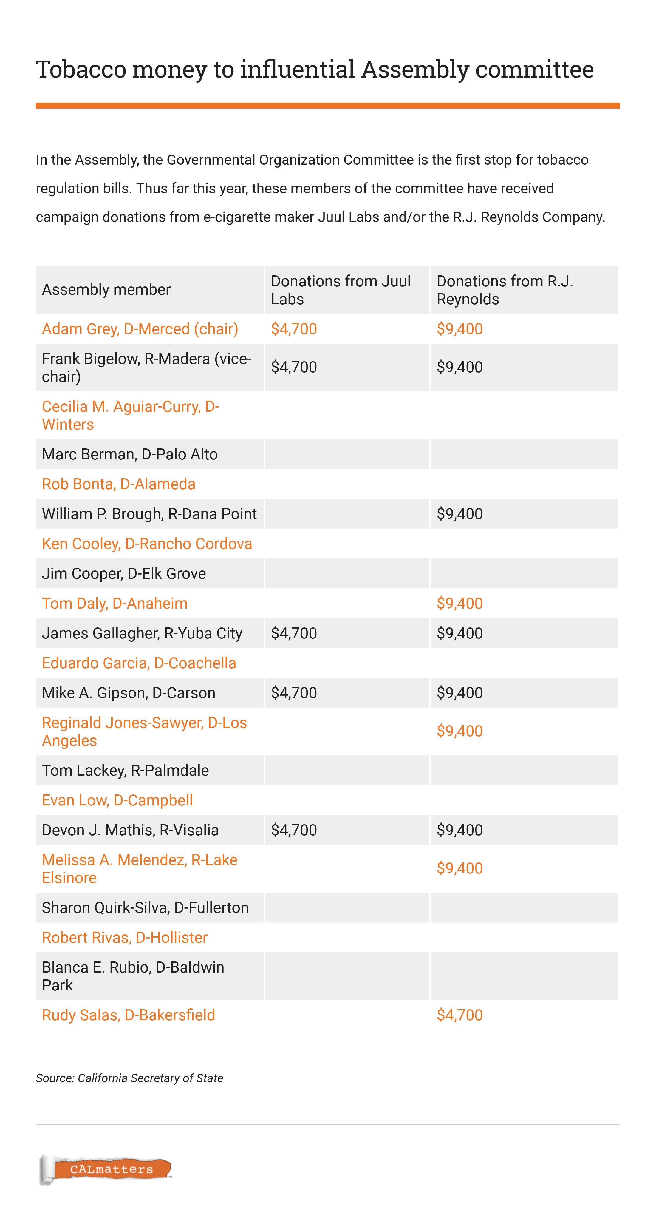 Tobacco money is nothing new in Sacramento, but now San Francisco-based Juul Labs, the largest electronic cigarette maker, is also moving thousands of dollars to elected officials—particularly targeting members of the Assembly’s Governmental Organization Committee that Gray chairs.