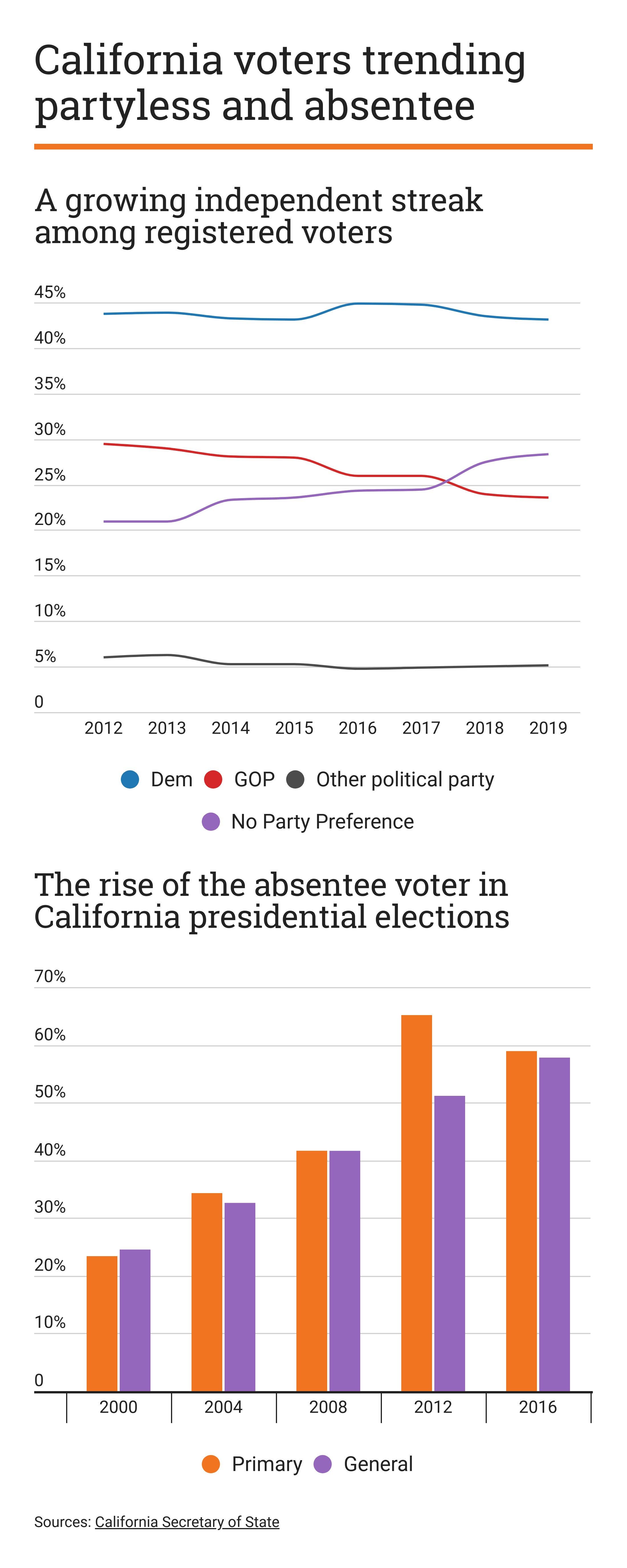As political independents and absentee voters make up an increasing share of the California electorate—one disproportionately made up of non-white and young voters—that could leave a large, perhaps determinative, portion of the electorate confused and left out of the process.
