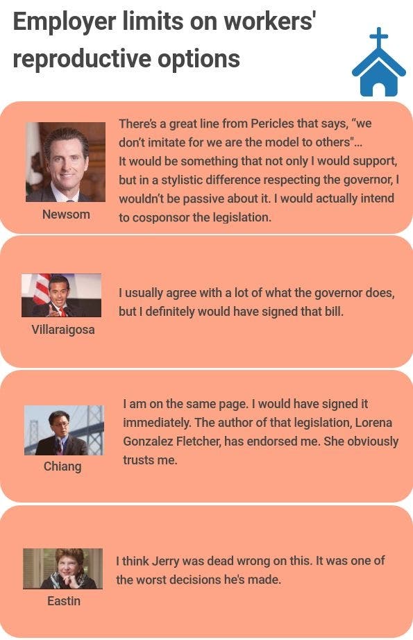 Critics of the bill questioned how common it really is in California for a person to be fired for such choice. Religious groups said it would infringe on their right to hold employees to a code of conduct in line with the tenets of their faith. Gov. Jerry Brown vetoed it, arguing current law goes far enough.