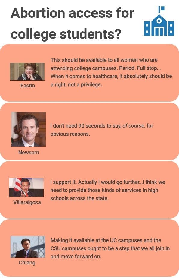 On Tuesday night, the four Democrats running to be governor of California met in San Francisco to spell out exactly where they stand on abortion, birth control access, and other matters of reproductive health.
