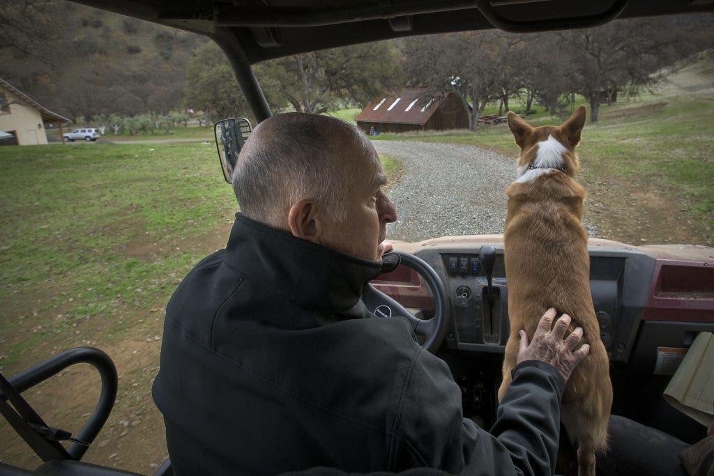 Photo Credit: California Gov. Jerry Brown drives around at his ranch property with his dog, Colusa, near Williams on Saturday, Dec. 22, 2018. (Photo by Randall Benton for CALmatters.)