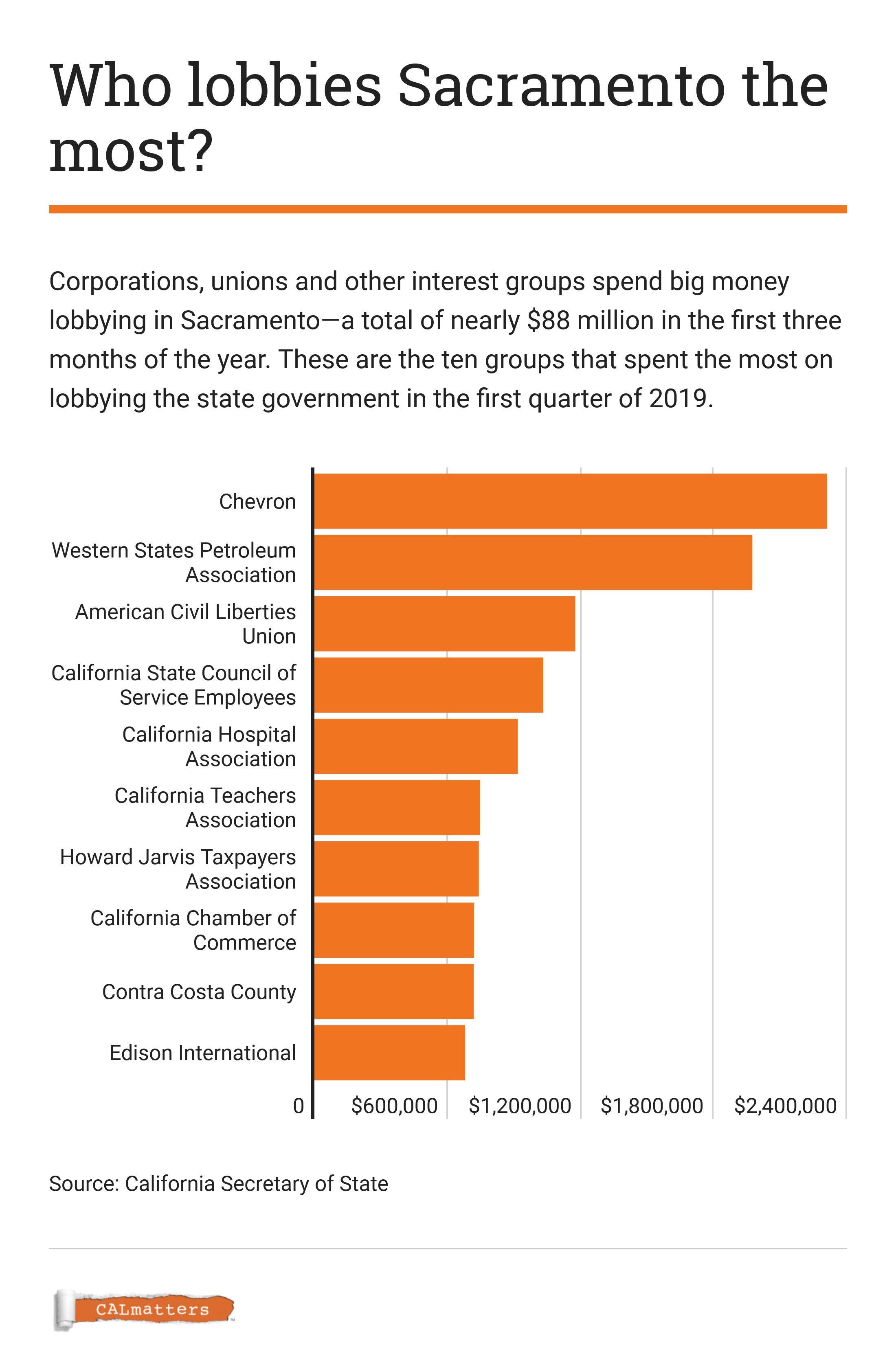 Good lobbying is expensive. The Chamber is among the biggest spenders on lobbying in Sacramento—nearly $720,000 in the year’s first quarter. The Chamber joined major tech firms in lobbying against two bills that would have expanded consumer protection under a landmark data privacy measure California passed in 2018. Lawmakers quietly shelved both of them.