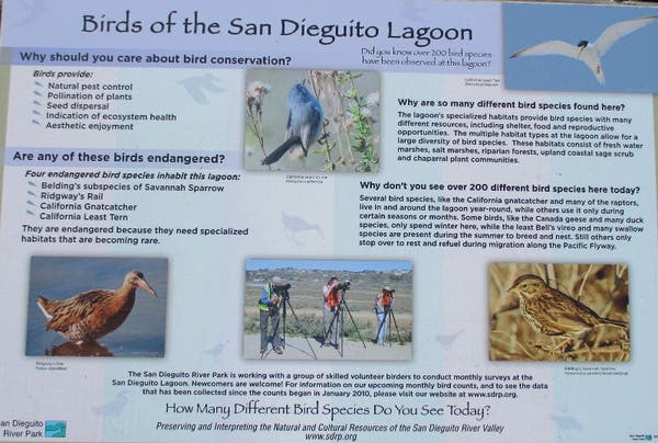 - With fresh and saltwater marshes, riparian forests, upland coastal sage scrub and chaparral plants, the San Dieguito Lagoon is home to over 200 species of birds. The park includes a trailside classroom, used for research. When not in use, visitors and trail users can rest, relax, watch the birds, meet friends and enjoy the lagoon. (Cool San Diego Sights!)