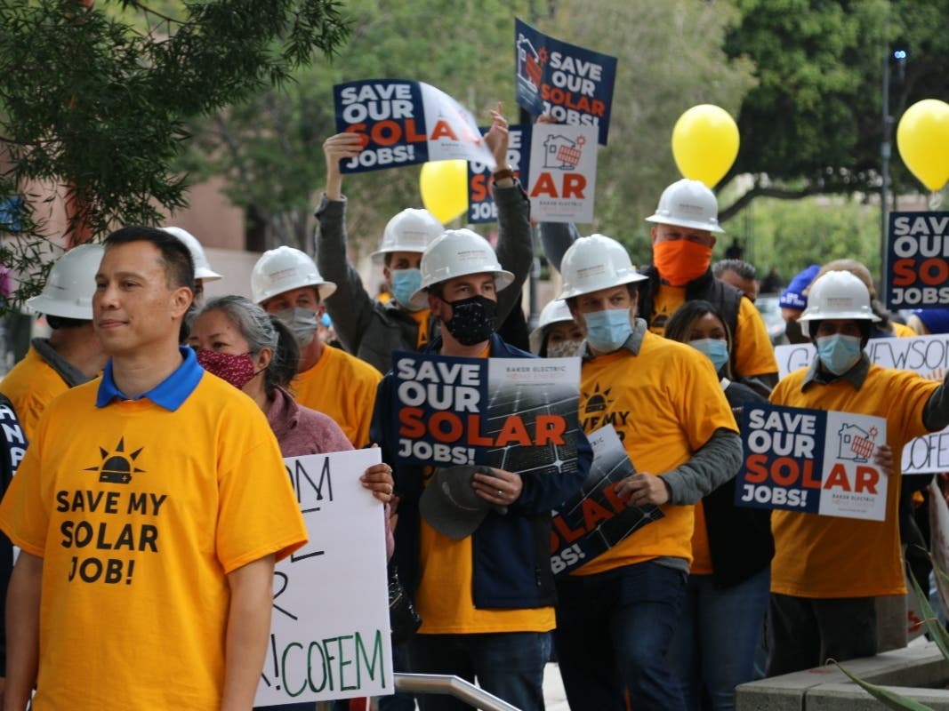 San Diego rooftop solar workers traveled to Los Angeles to call attention to drastic, unaffordable changes proposed for new solar customers