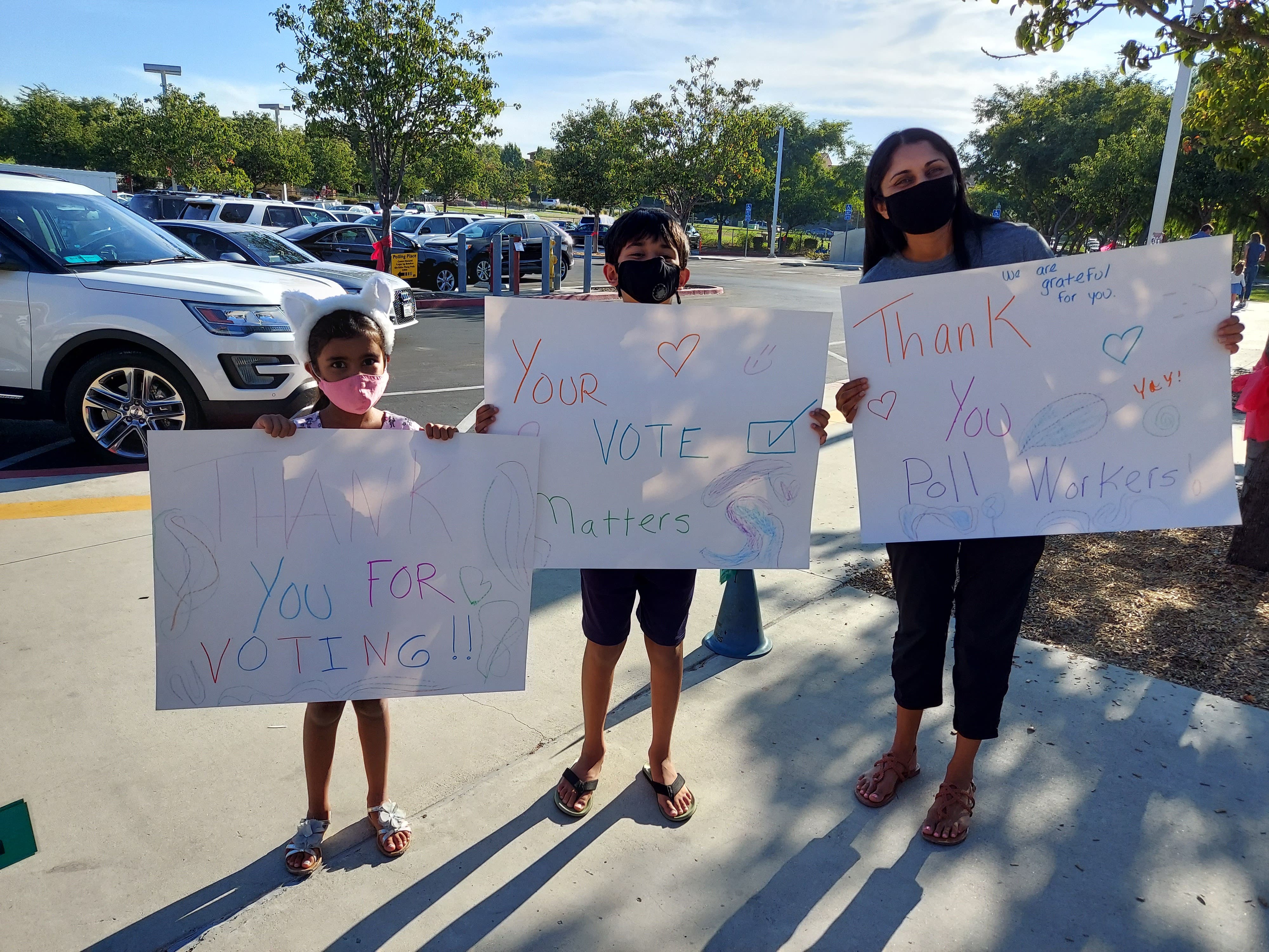 SAN DIEGO COUNTY, CA — Patch reader Deborah Johnson captured this photo of a family cheering for voters near a polling place at Monterey Ridge Elementary School in San Diego. Harshal Purohit-Patel, her son Jaimin and daughter Raina of 4S Ranch are pictured.