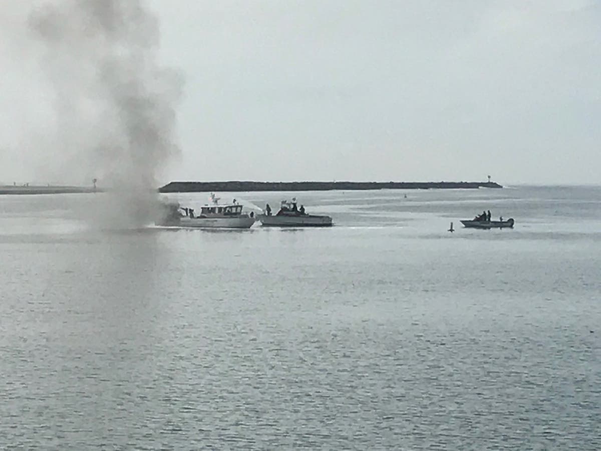 The people aboard the small boat got out safely, fire officials said. There were no injuries.