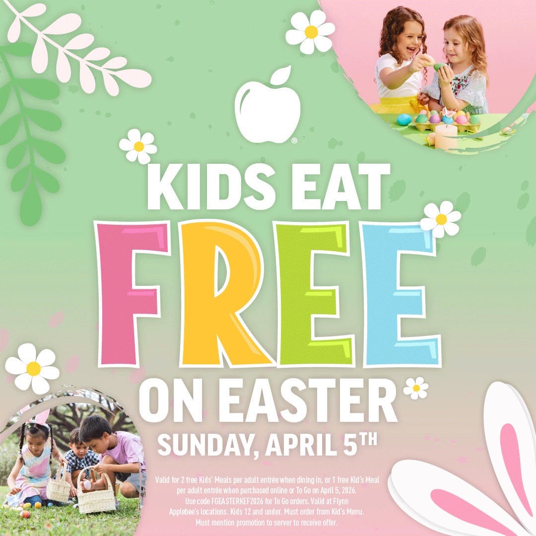 Flynn Applebee's is also offering the deal for to-go orders. Customers who order to-go meals can get one free kids' meal with each adult entrée purchased by using the promo code FGEASTERKEF2026 when ordering online, at Applebees.com, or by phone. There is a limit of four free kids' meals per to-go order.