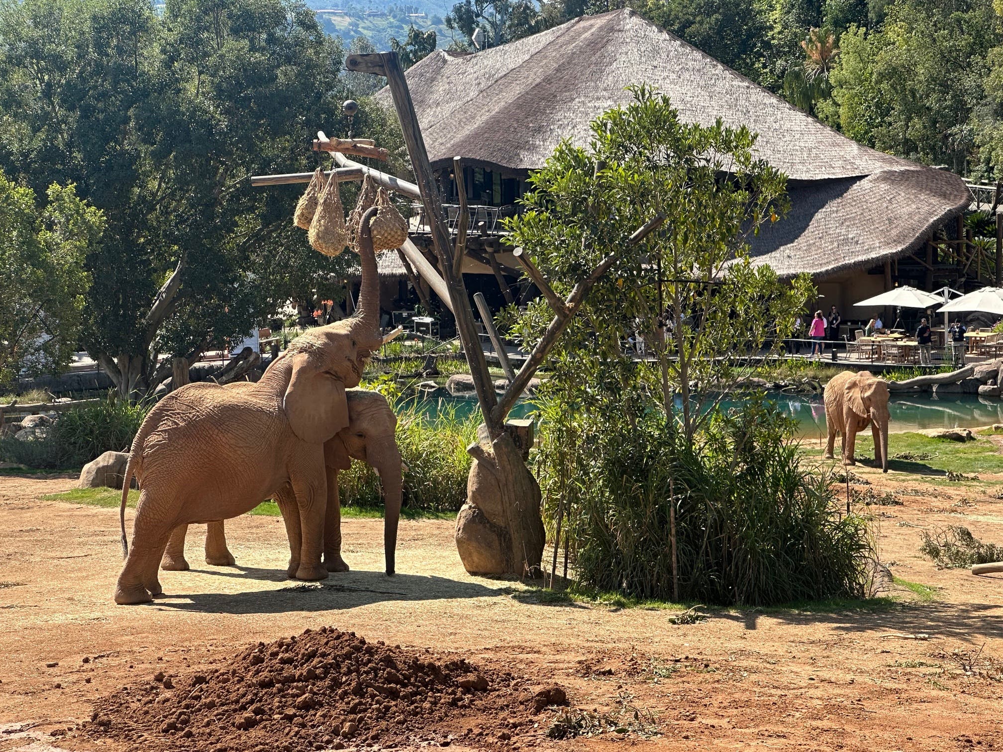The habitat, named for philanthropist Denny Sanford, features two large watering holes, including a 240,000-gallon pool where elephants can wade, swim and play while visitors watch from nearby viewing areas.