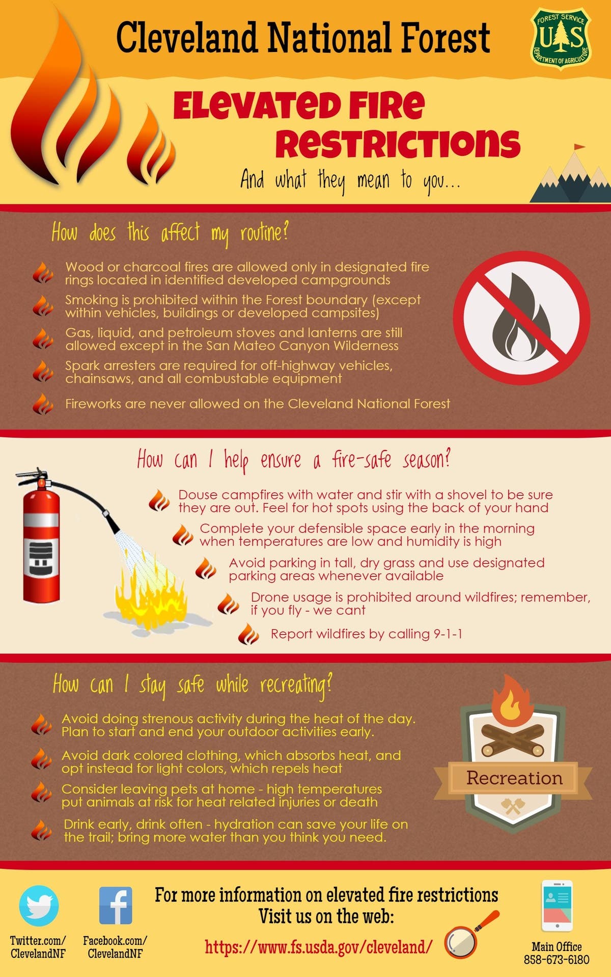 SAN DIEGO COUNTY, CA – Cleveland National Forest will operate under elevated fire restrictions beginning Monday, the U.S. Forest Service announced. Elevated fire restrictions are put into effect when fire danger levels increase due to weather conditions, seasonal temperatures and elevated risk indexes, such as high winds or lightning.