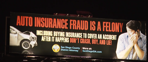 - The San Diego District Attorney’s billboards warn that insurance fraud is a felony and could result in prison time. More than 15 percent of all auto insurance claims are fraudulent, and prosecutors are going after the perpetrators. Repeat offenders can get up to five years prison time. Seems harsh? Remember, we all pay for this kind of fraud through higher insurance costs. (CBS 8)